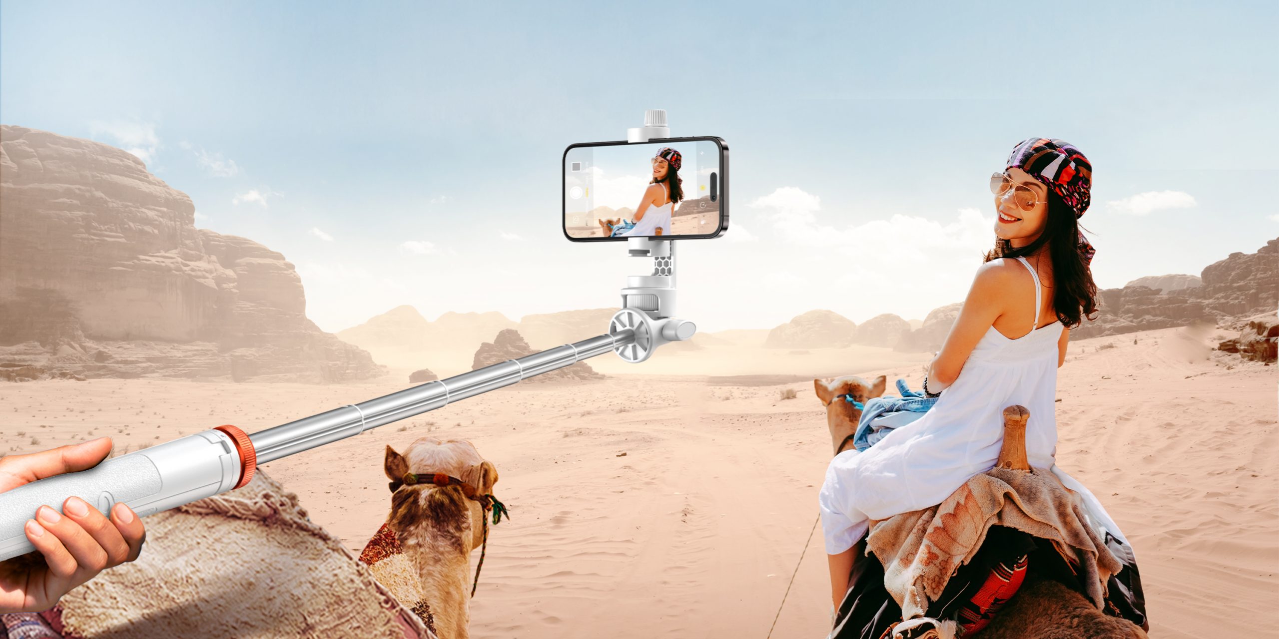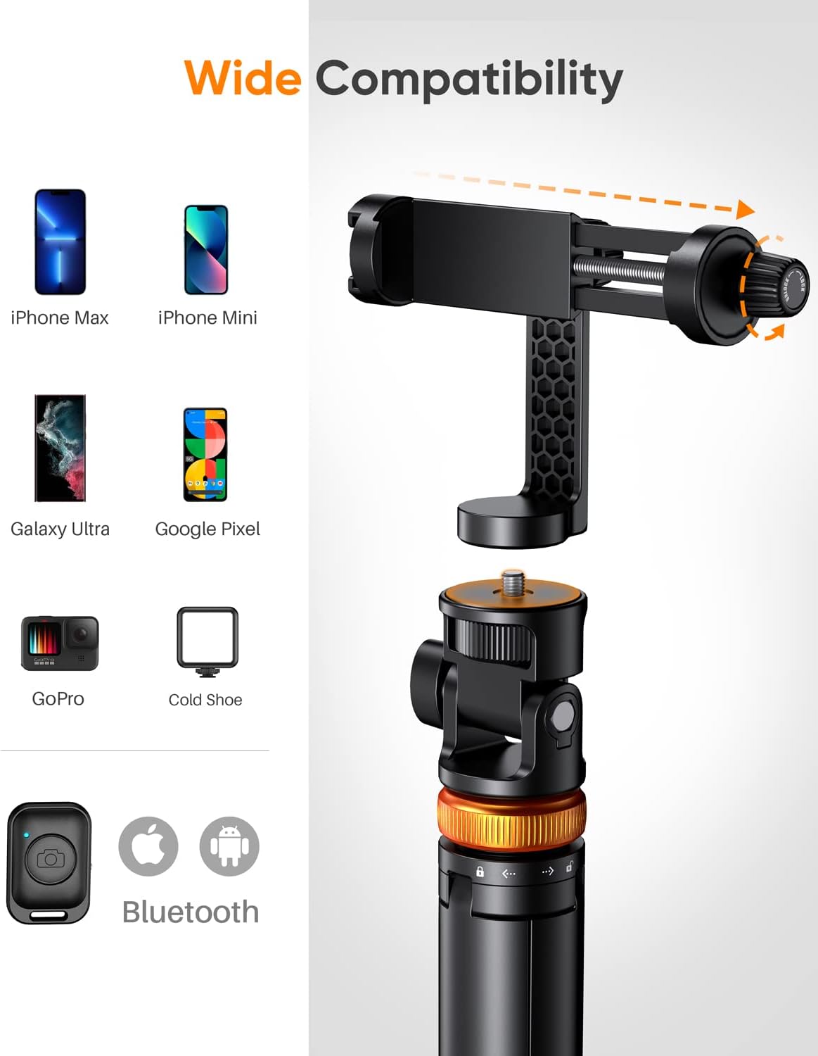 Go from compact to full height in a flash – up to 62″ – for selfie shots, overhead framing, or vlogging. - Multi‑Functional 2‑in‑1